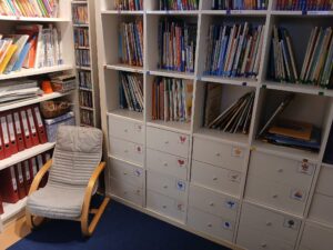 Dieser Bereich umfasst eine gemütliche Couch, sowie einen offenen Bücherschrank, der jederzeit für die Kinder zugänglich ist. Zusätzlich stehen den Kindern zwei Kuschelsessel für den Rückzug oder die intensive Auseinandersetzung Büchern zur Verfügung.