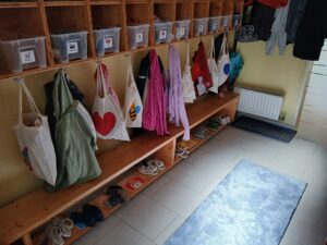 Die Ausstattung umfasst einen gekennzeichneten, personalisierten Sitzplatz, Kleiderhaken sowie Schuhabstellplatz pro Kind. Weiters steht jedem Kind eine durchsichtige Box für persönliche Gegen stände (Handschuhe, Sonnenschutz, Mützen, .) zur Verfügung.