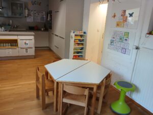 Im Gruppenraum befinden sich 6 Tische bzw. Tischgruppen mit ausreichend Sitzgelegenheiten für alle Kinder. Die Tischgruppen wurden so konzipiert, dass sich sowohl kleinere als auch größere Sozialformen ergeben können (2-er Tische, 3-er Tische, 4-er Tische, 6-er Tische). Die Kinder haben die Möglichkeit, ihren Bedürfnissen entsprechend zu wählen. Das Tischspielmaterial unterteilt sich in einen Schrank mit Puzzles und Holzsetzspielen, einem Schrank mit Regel- und Gesellschaftsspielen sowie einem Schrank mit Kleinkonstruktionsmaterial, Holzlaptop, Konzentrationsspielen und Spielen zur Schulung der fein motorischen Fertigkeiten (fädeln, knöpfen, binden…).
