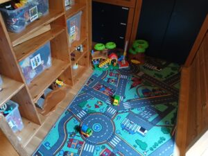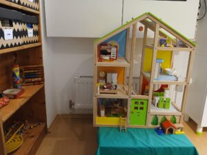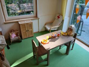 Der Bereich Kleine Welt befindet sich, vom Gruppenraum durch eine „offene“ Wand abgetrennt, neben den Toiletten. Dieser Raum umfasst ein voll ausgestattetes Puppenhaus, einen Spielteppich, ein Regal mit Trödelspielen, einen bequemen Sessel als auch eine vielfältige „Bibliothek“. Die Eigentumsladen als auch die Portfoliomappen befinden sich in diesem Bereich, der sowohl zum Rollenspiel einlädt als auch als Rückzugsort genutzt werden kann.