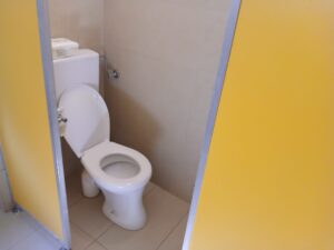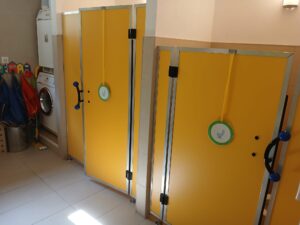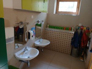 Der Sanitärraum verfügt über 2 separate Kindertoiletten, die mit einer Schwungtür ausgestattet sind, die für Privatsphäre sorgen. Weiters sind 2 Waschbecken, 2 Sicherheitsspiegel Handtücher, Mistkübel in Kinderhöhe verfügbar, die einen selbstständigen Toilettengang bzw. das selbstständige Ausüben von Hygieneabläufen gewährleisten. Eine Waschmaschine und ein Trockner zählen zur Ausstattung in diesem Bereich.