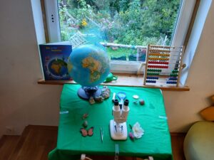 Der Bereich Technik, Forschen und Umwelt umfasst einen Tisch, der je nach Thema ausgestattet wird. Standard in diesem Bereich sind: Lupen, Taschenlampen, Naturmaterialien und ein Globus.