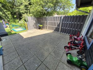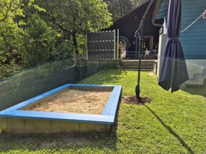 Durch eine, neben dem Baubereich befindlichen Türe gelangt man in den Garten. Die an den Gruppenraum angrenzende Terrasse, ist ein mit Fahrzeugen ausgestatteter Bereich (Dreiräder, Rutschahrzeuge), der (witterungsbedingt) von den Kindern genutzt werden kann, da er von allen Seiten des Gruppenraumes einsichtig ist. Durch drei Steintreppen gelangt man in den Garten, der mit Sand- und Matschbereich, Rutsche, Spielhaus und Balancierstange ausgestattet ist. Ebenso ermöglicht ein Hochbeet und ein „Schaukomposter“ die intensive Auseinandersetzung mit der Natur und ihren Abläufen sowie Einblicke in die Entstehung unserer Ernährung.