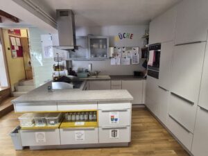 Da in unserem Kindergarten die gesunde Ernährung ein wesentlicher Bestandteil unseres Konzeptes ist, werden sämtliche Mahlzeiten in der zum Gruppenraum gehörigen Küche zubereitet. Die Küche umfasst die dafür nötige Ausstattung und wurde dahingehend behördlich abgenommen. Durch das offene Raumkonzept der Küche ist ein mit den Kindern Kochen, Einsicht für die Kinder in die Kochabläufe, als auch ein Interagieren zwischen Gruppenraum und Küche jederzeit möglich. Zur Sicherheit der Kinder ist eine versperrbare Abtrennung als auch ein Spritzschutz zwischen Gruppenraum und Küche gegeben.