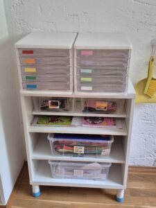 Das Material wird im Gruppenraum durch offene Schränke und durchsichtige Boxen sichtbar gemacht, sodass die Kinder jederzeit frei wählen können. Der Materialwechsel erfolgt generell partizipativ. Wir passen das Material an die Bedürfnisse der Kinder an.